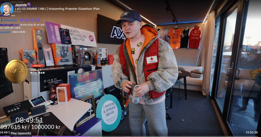 Den danske streamer Jacob “Jaxstyle” Krull fra Aalborg formåede på under fem døgn at indsamle 1.338.506 kroner til Røde Kors. Indsamlingen fandt sted gennem et såkaldt charity subathon, som blev streamet døgnet rundt fra en glascontainer på Rådhuspladsen i København fra den 26. december.